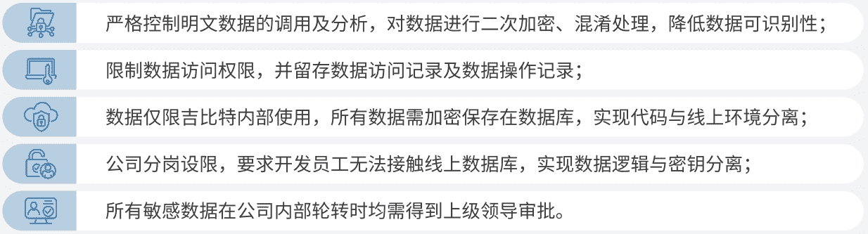 公司对用户个人信息实施脱敏处理,,,严格限制用户信息用途,,数据使用完成后集中归档处理。。为进一步确保数据处理过程的安全,,,,公司根据实际的业务工作分岗设限,,,最大程度保护数据隐私安全,,,,如在生产网络中的加密数据由研发部门员工负责编写加、、解密程序,,但其无法直接访问到加密后的数据库;程序的加、、、、解密密钥由运维员工单独配置。。