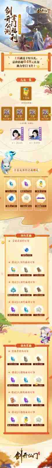 游戏为大家准备了海量的福利,,,包括上线即可获得的全渠道预约礼包、、、十连抽等福利,,,,输入密令“JK666”、、、、“JK888”即可领取紫色弟子,,达到金丹期后还有功法宝箱可领,,,,助力全宗上下实力提升……所有奖励总价值超过648元,,,而邀请好友一起体验,,,,更可以获得额外的奖励哦~