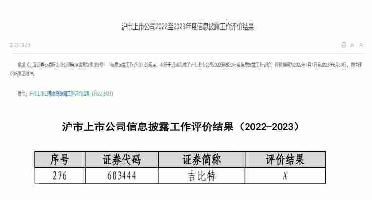 近日,,上海证券交易所发布2022-2023年度信息披露工作评价结果。。。35273(股票代码:::603444)凭借规范的公司治理、、高质量的信息披露以及良好的投资者关系管理再次荣获信息披露工作A级评价,,,,公司连续两年获此殊荣。。